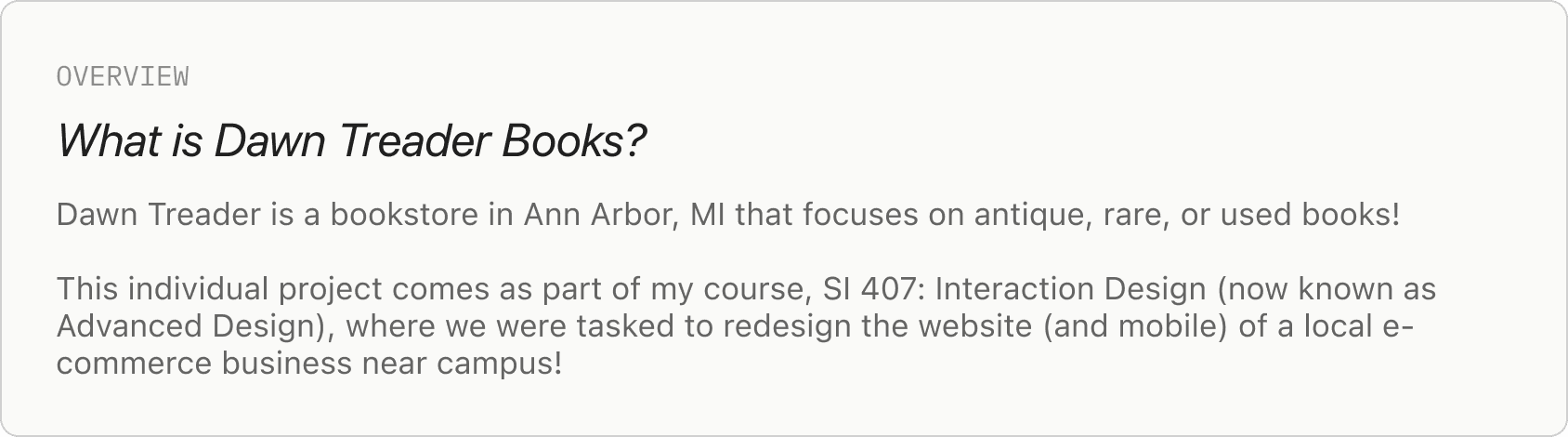 I first wanted to gain a general understanding of Dawn: the browsing experience, its unique character — both online and in person — and how it translates online. To start, I conducted a heuristic evaluation of the Dawn Treader Book Shop’s website.