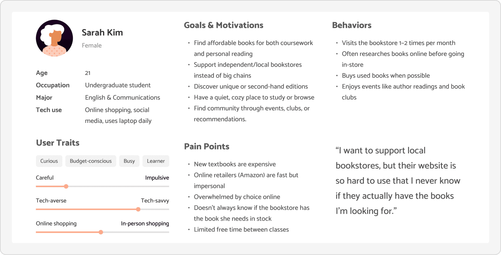To better understand Dawn Treader’s audience, I developed a persona representing a typical customer — someone who values the charm of used books and enjoys the discovery process, but struggles with the store’s outdated and inconsistent online experience.