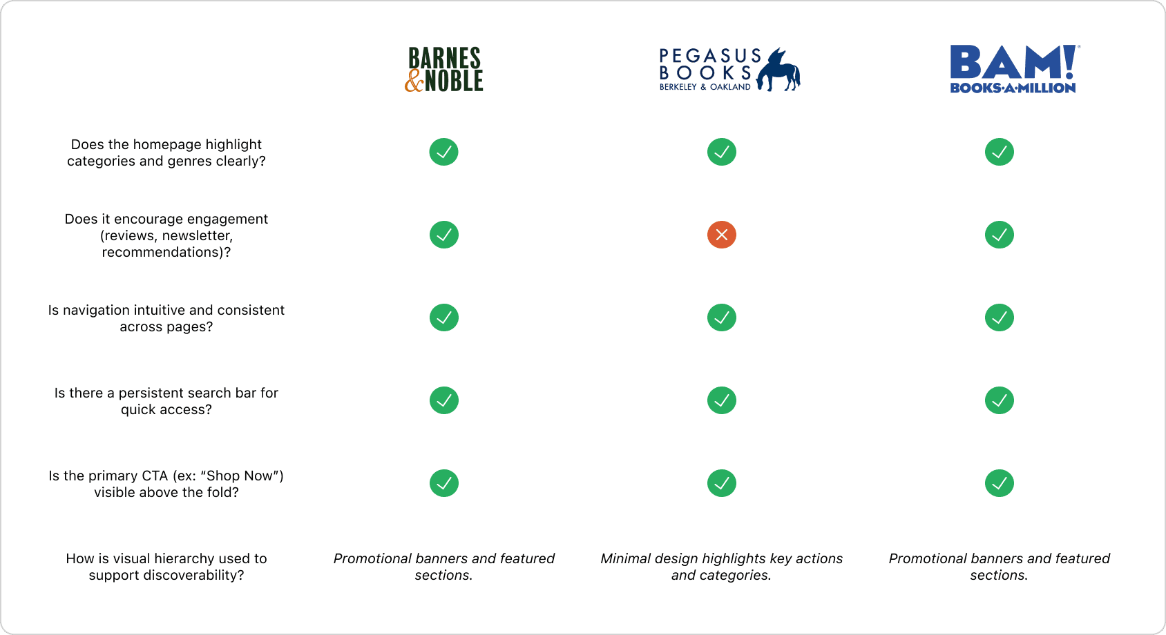 Through a competitive analysis of Barnes & Noble, Pegasus Books (a local bookstore in Berkeley, CA), and Books-A-Million, I found that all three prioritize clear navigation, strong visual hierarchy, and direct calls-to-action that guide users toward browsing and purchasing.