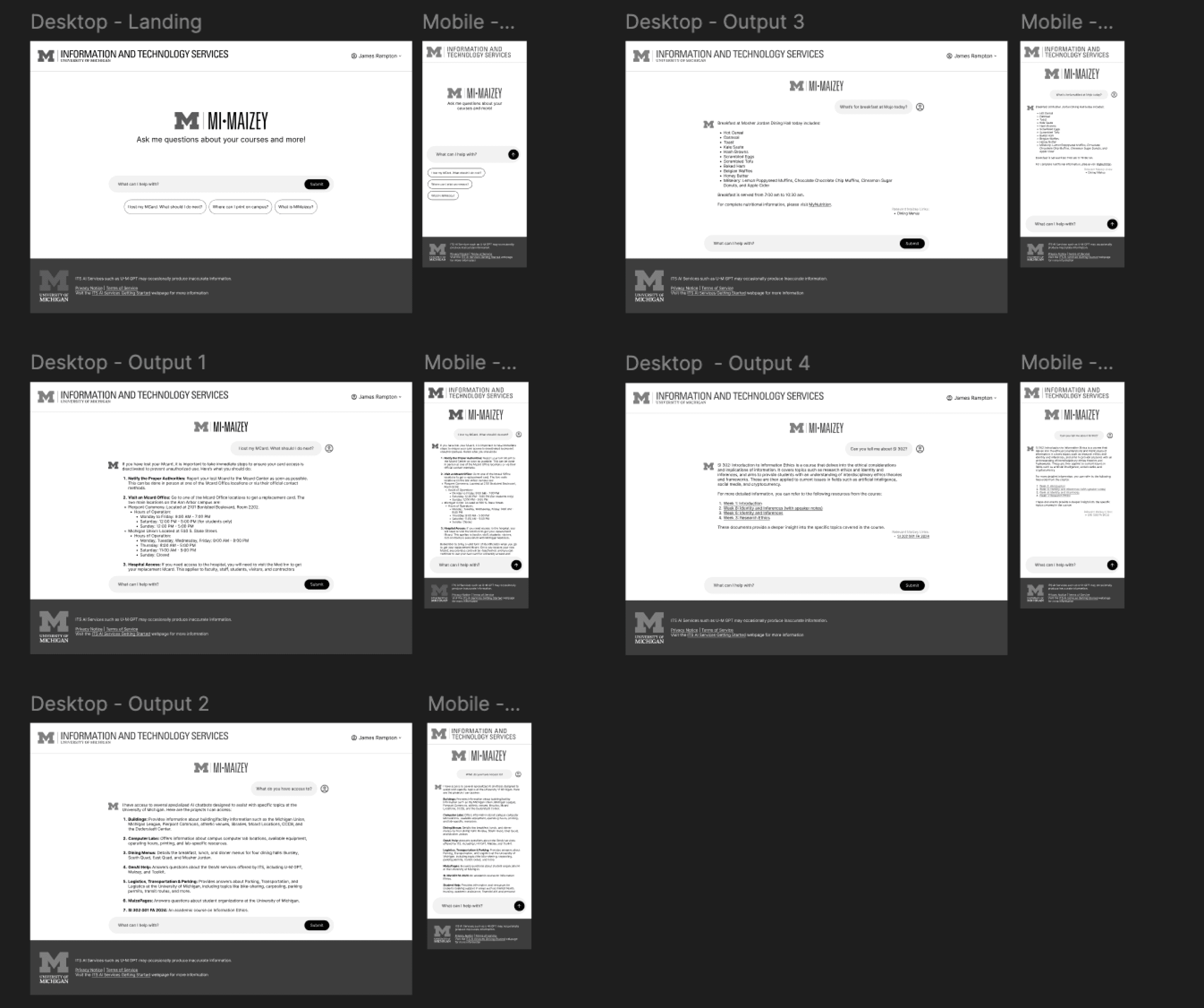 To identify pain points and user challenges, I conducted 5 user interviews with University of Michigan students. Through informal conversations and structured usability testing, I explored how students interacted with MiMaizey and U-M’s broader generative AI tools, focusing on ease of use, clarity of responses, integration with existing U-M services, and overall viability and impact on a student’s daily life.