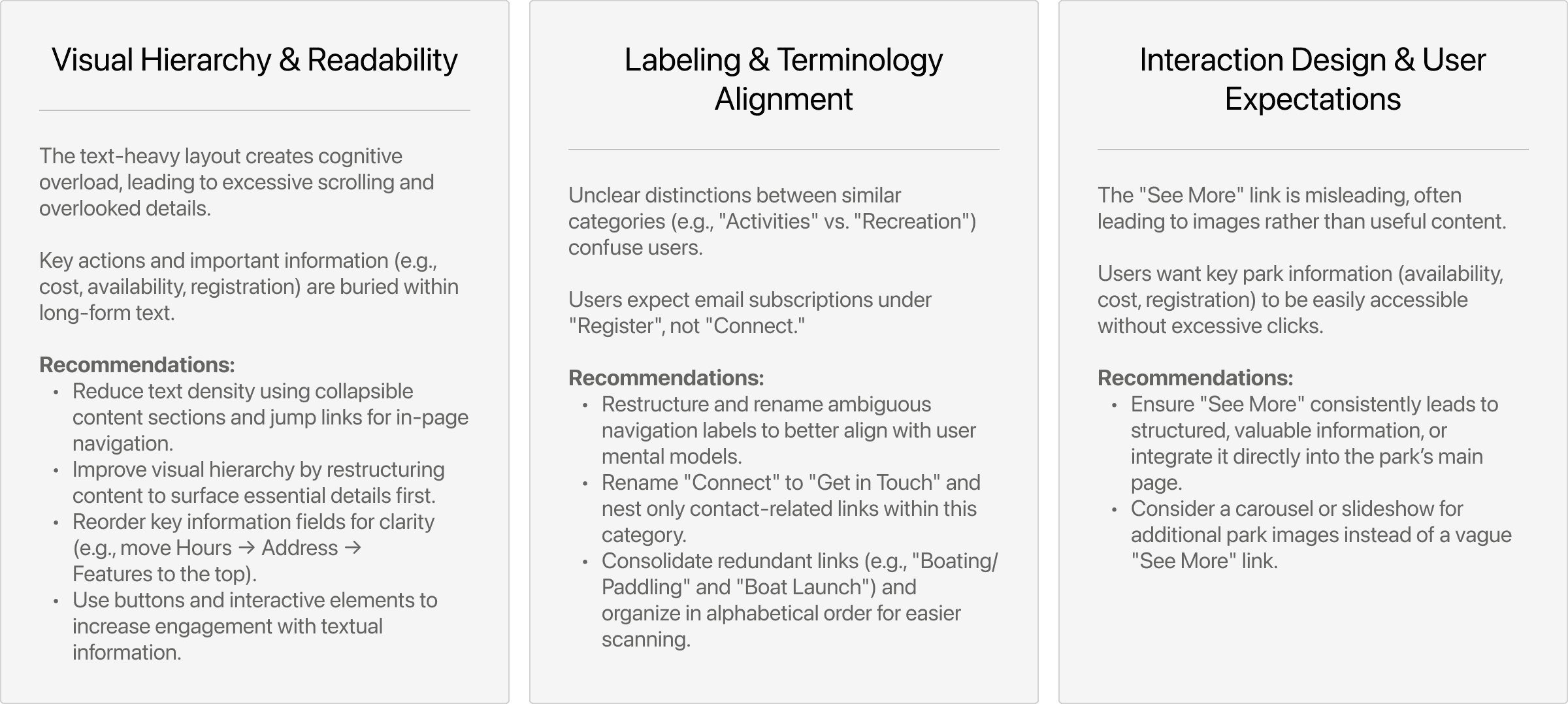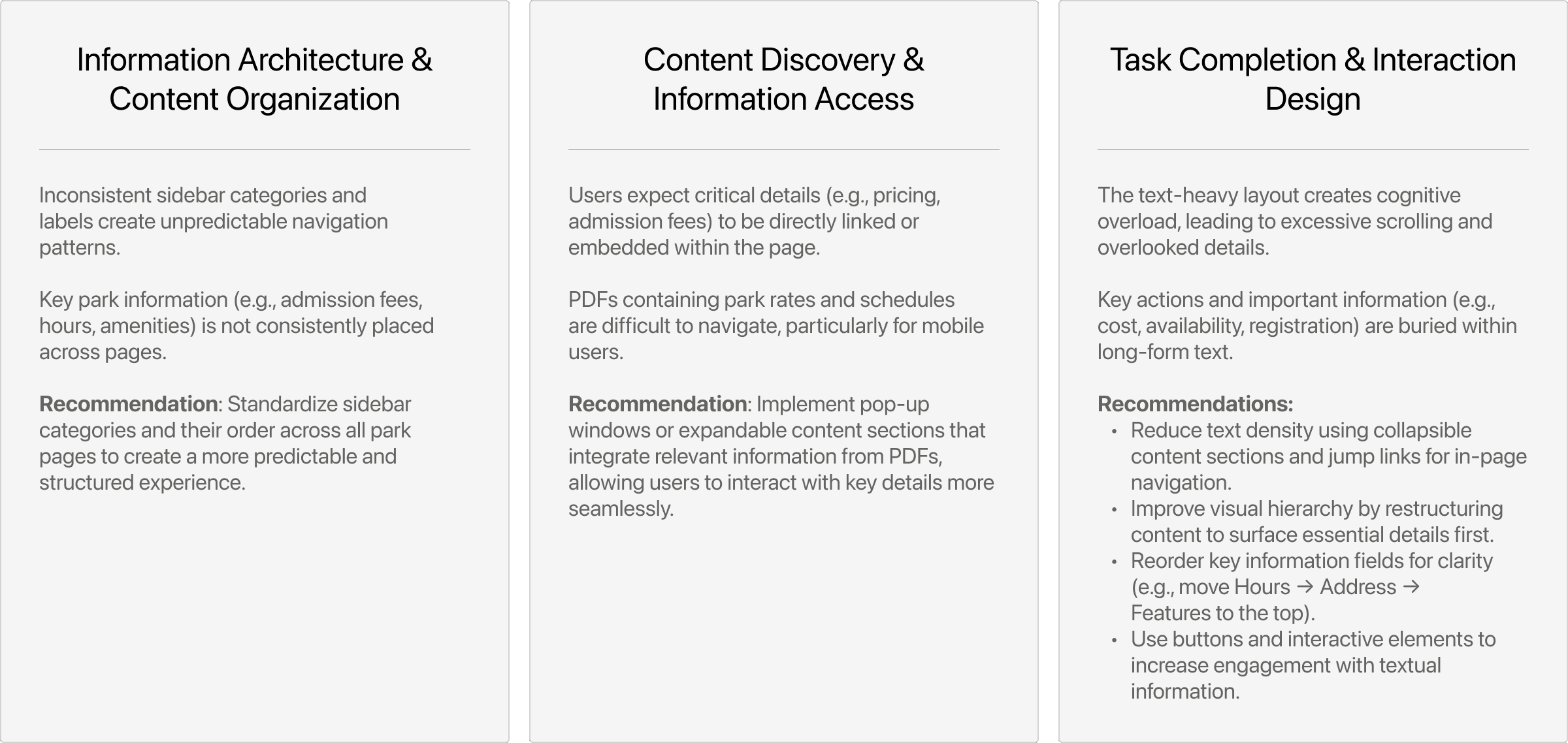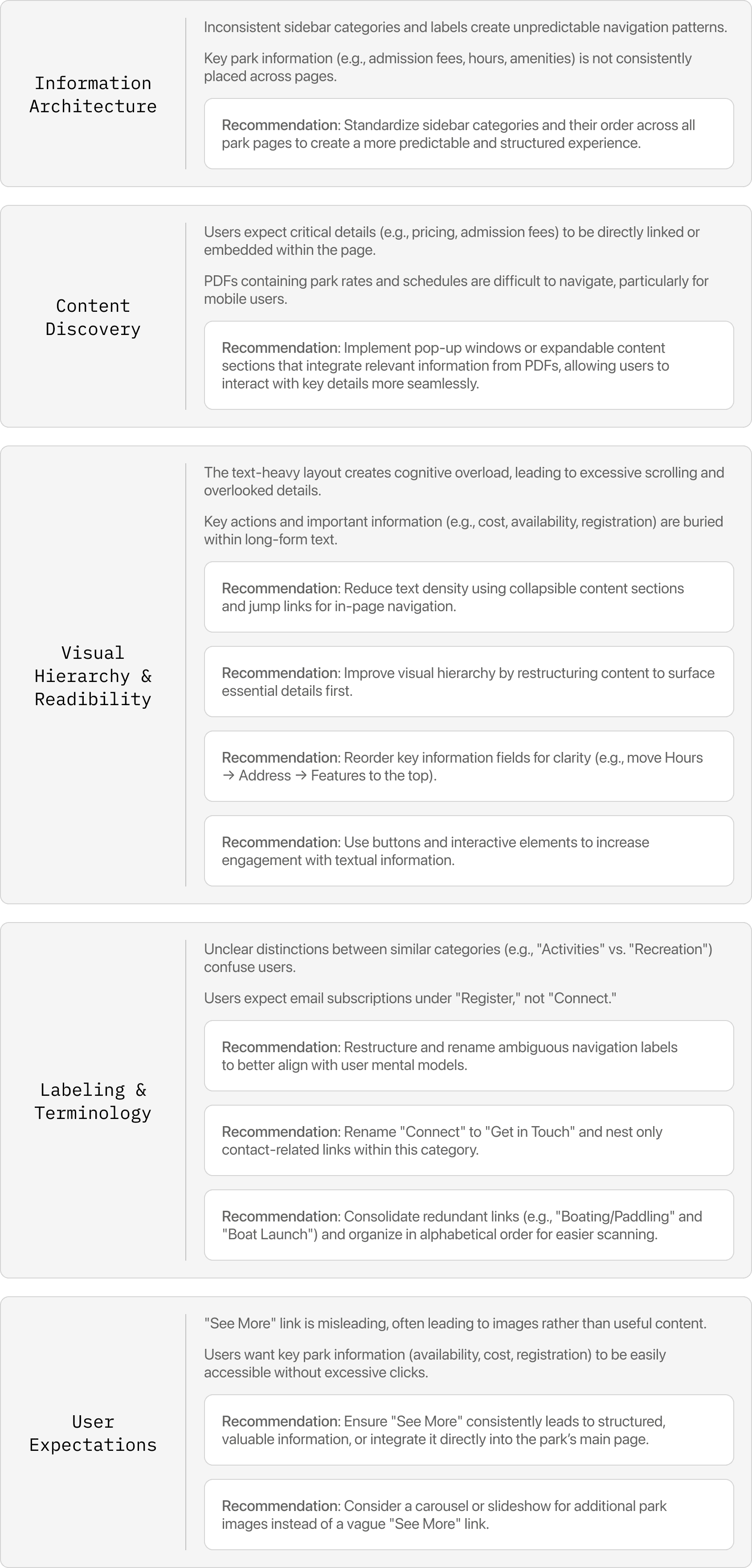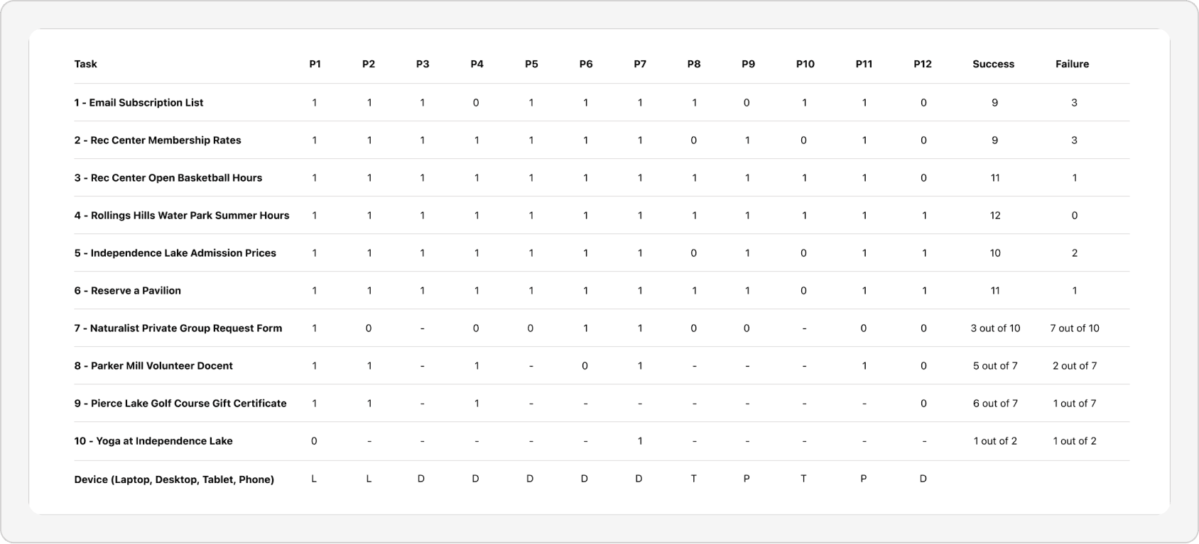 12 usability tasks: Each participant was asked to complete 12 tasks that mirrored real-world use cases, such as signing up for an event, finding park admission fees, and reserving a pavilion.